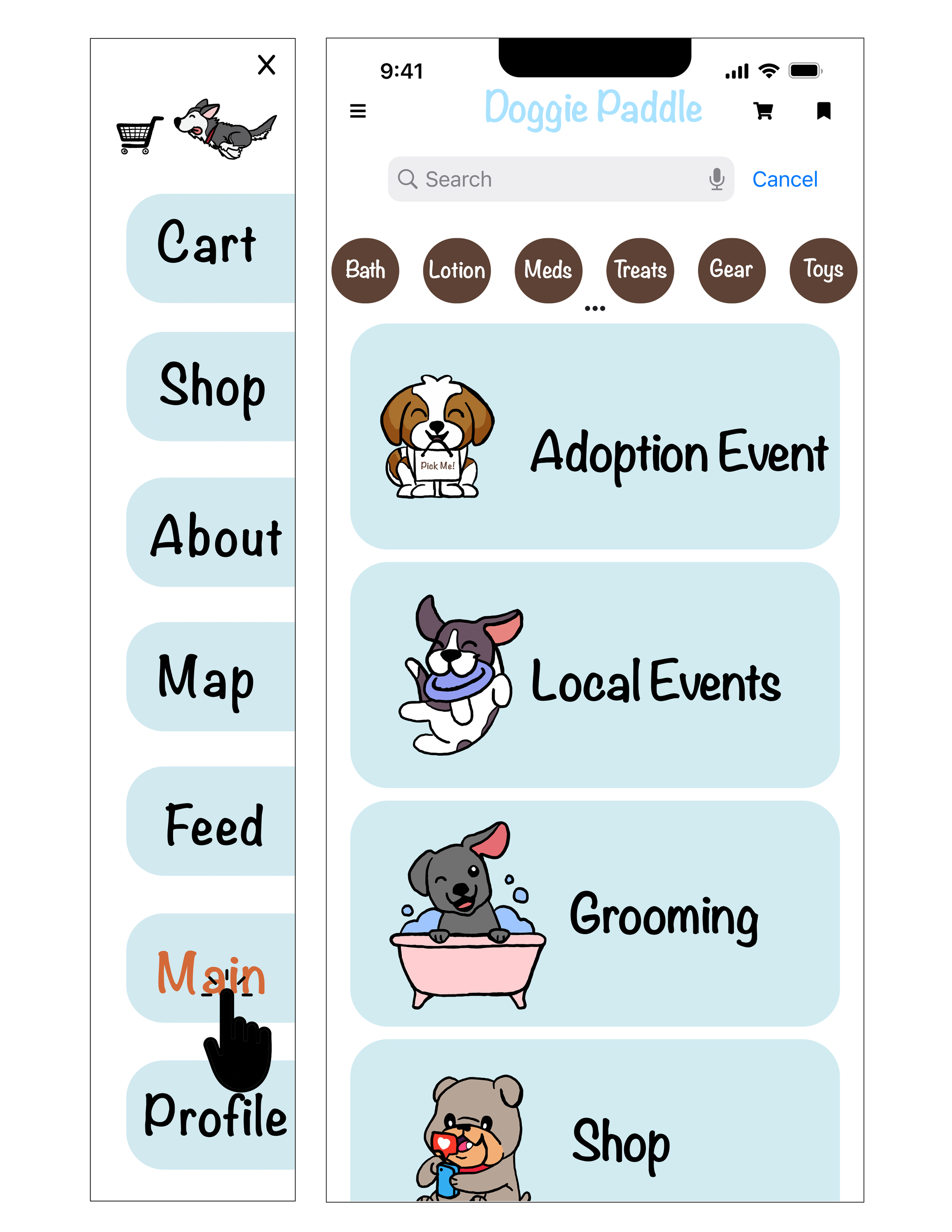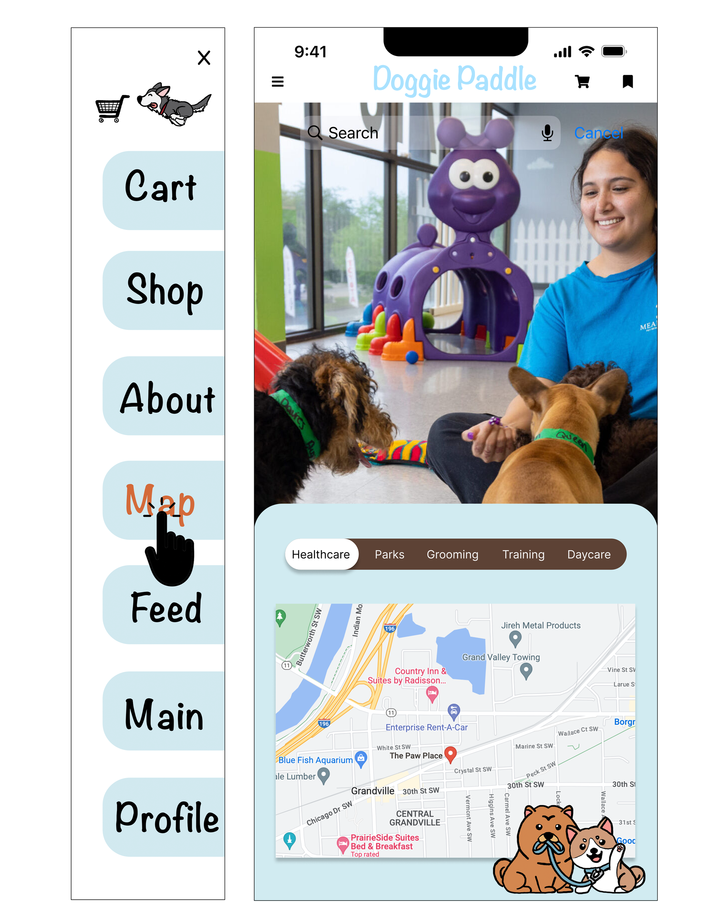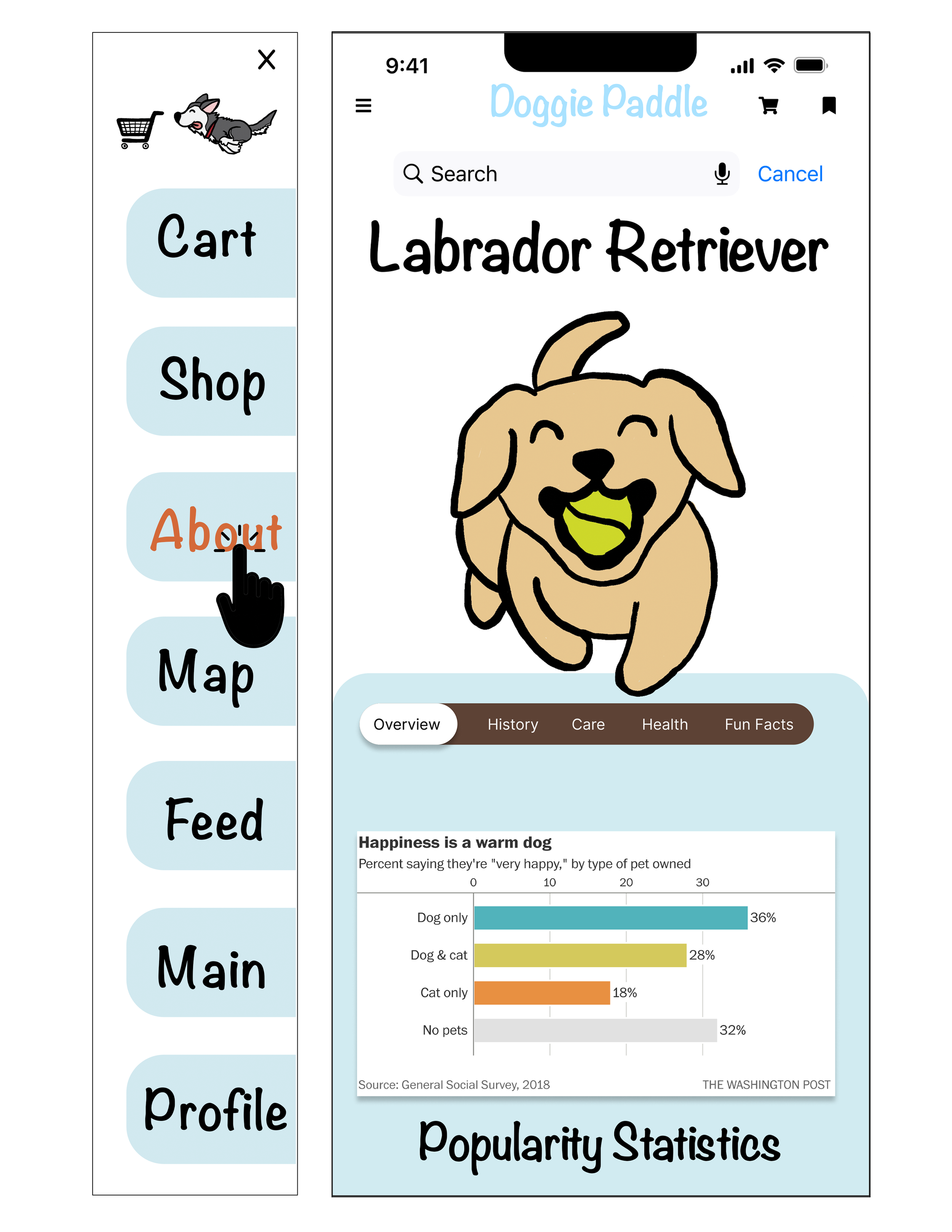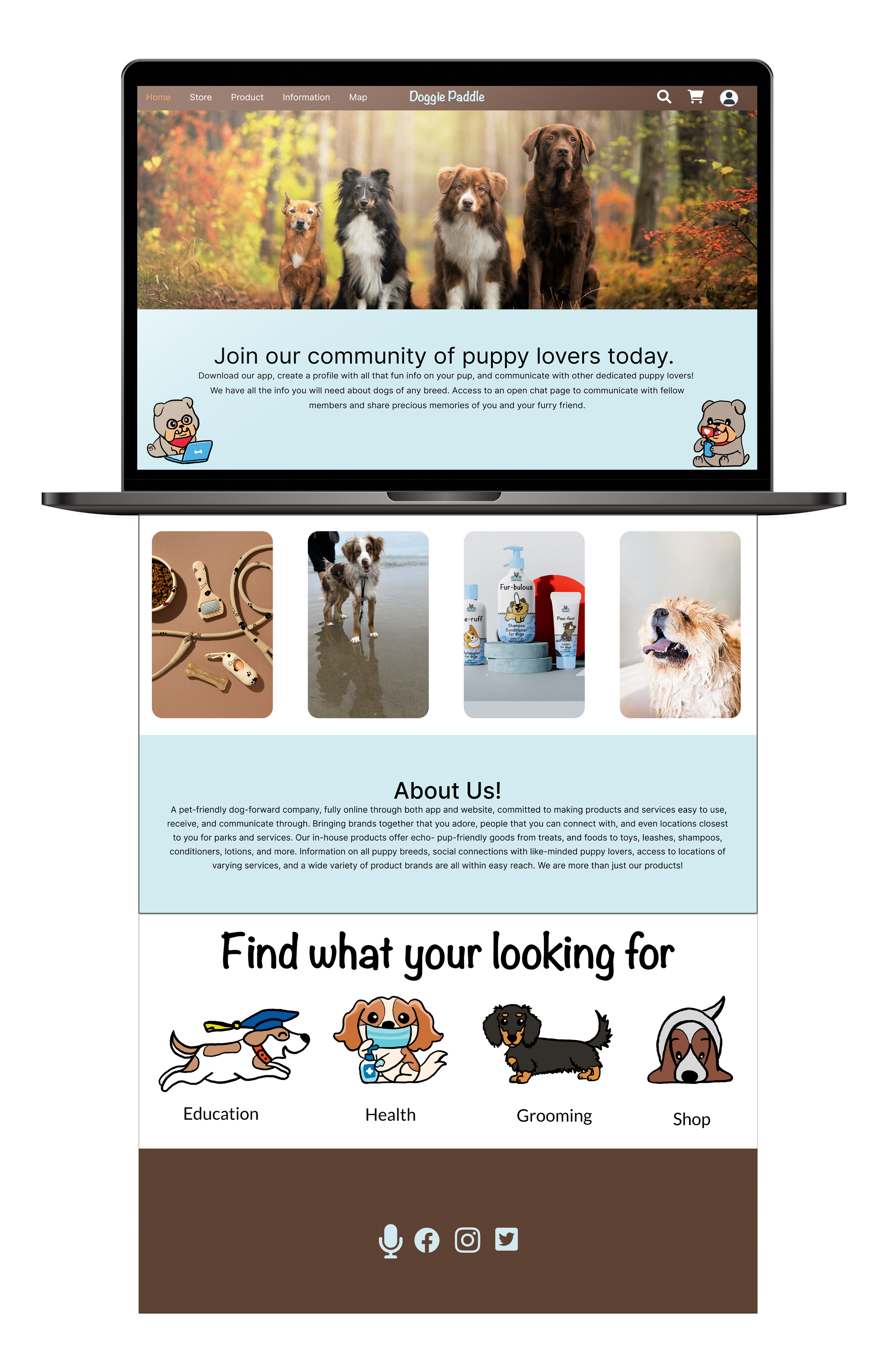 Using a user-friendly approach, Doggie Paddle is a completely dog-oriented digital platform. The goal is to provide the opportunity to communicate, purchase, and research about their pup as well as other breeds. Pushing this multi-faceted approach a website and an app are available. As a member of the doggie community, access is given to purchase Doggie Paddle’s products and receive new product updates via postcards.